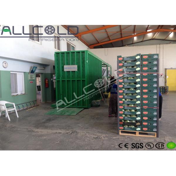 After the product is harvested and packaged, it is placed on pallets for shipping. The pallets are loaded into a vacuum tight chamber and the process begins. The equipment drops the pressure inside the vessel by removing air through vacuum pumps. Once the level of vacuum reaches the "flash point" moisture and heat are removed from the product in the form of water vapor. The lower the pressure inside the chamber, the lower the boiling point of water. As the vacuum goes deeper, more water vapor is removed and the product temperature is reduced until the desired temperature is achieved.
